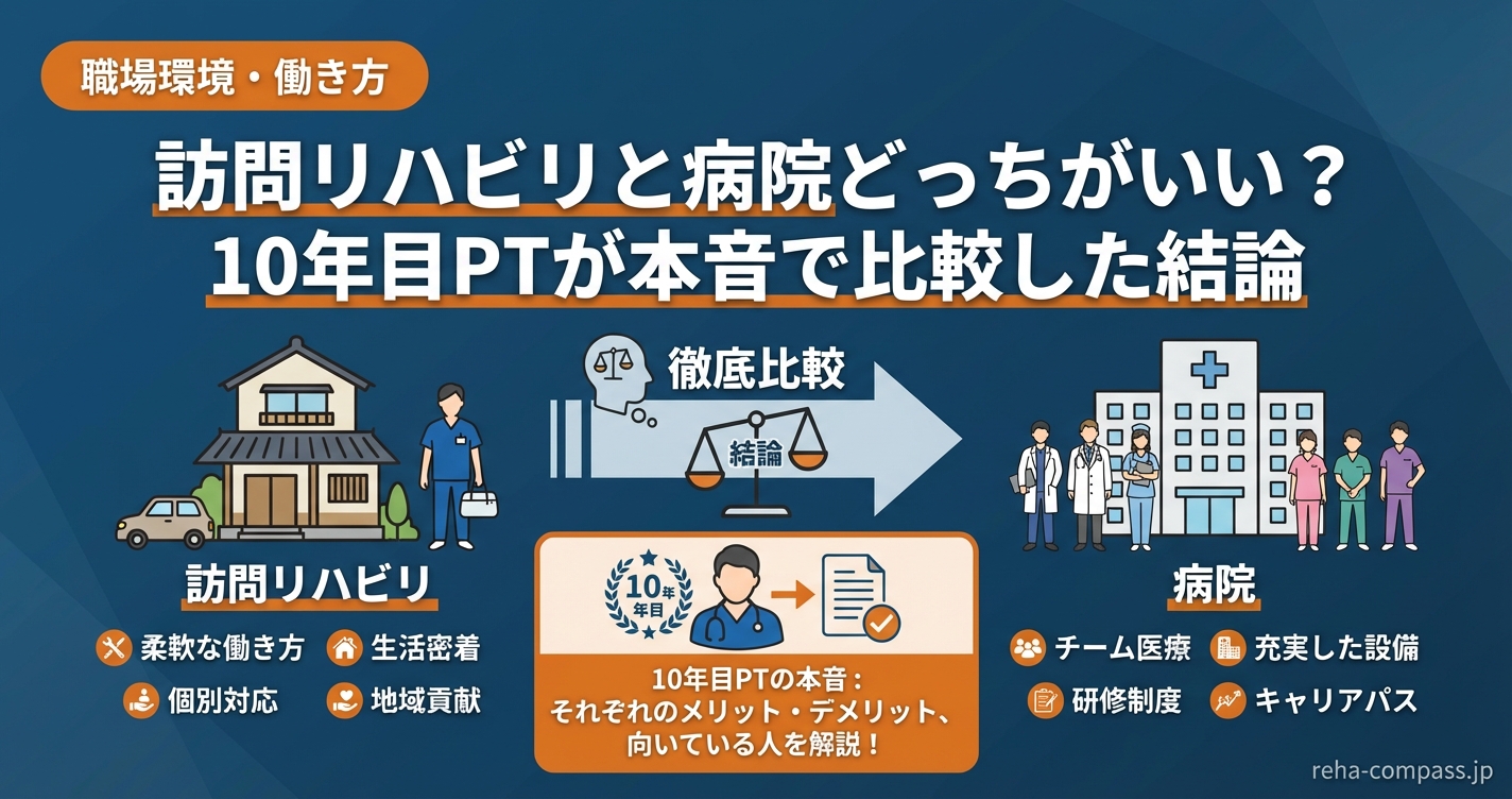 「訪問リハビリと病院、どっちがいいですか?」この質問、転職相談で本当によく聞かれます。正直に言うと、どっちが良いかという問いには意味がない。大事なのは「自分に合うのはどっちか」という視点です。